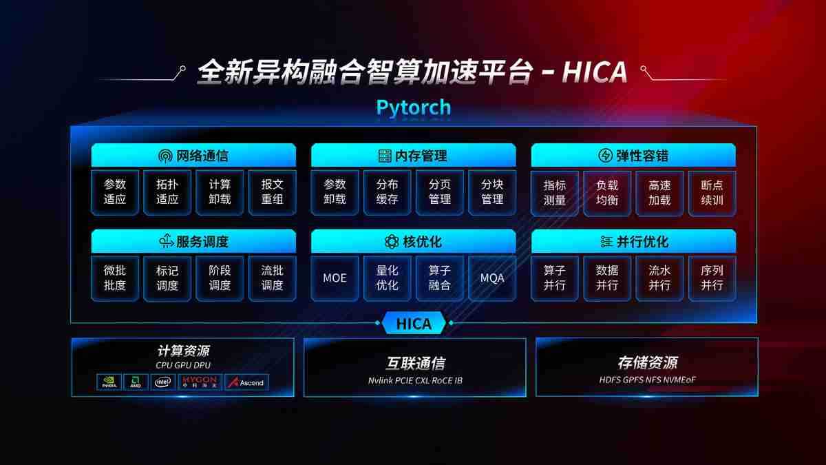 通过自研的服务层、、中间适配层、、、以及调度编排算法,,,,采用数据并行、、、模型并行等多种并行方式,,,把并行计算任务进行有效的分解,,,使其分别由相应的软件栈和算力资源来承接。。。当GPU资源变化,,,,HICA可以实时动态调度计算子任务并调整模型拓扑和架构,,,以充分聚合各种算力资源。。。。
